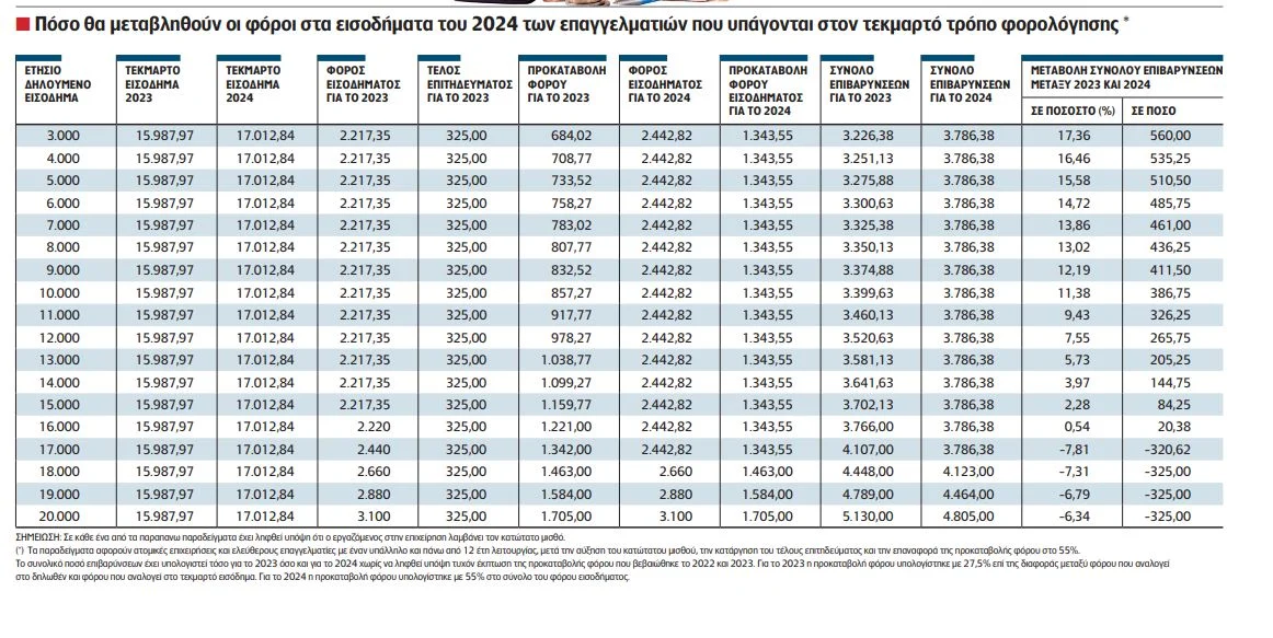 Τα μεγέθη των πρόσθετων επιβαρύνσεων που θα προκύψουν για όσους αυτοαπασχολούμενους δήλωσαν για το 2023 εισοδήματα χαμηλότερα των τεκμαρτών και θα εξακολουθήσουν και για το 2024 να φορολογούνται με βάση τα τεκμήρια φορολόγησης του ν. 5073/2023 παρουσιάζονται στον αναλυτικό πίνακα παραδειγμάτων που δημοσιεύουμε.