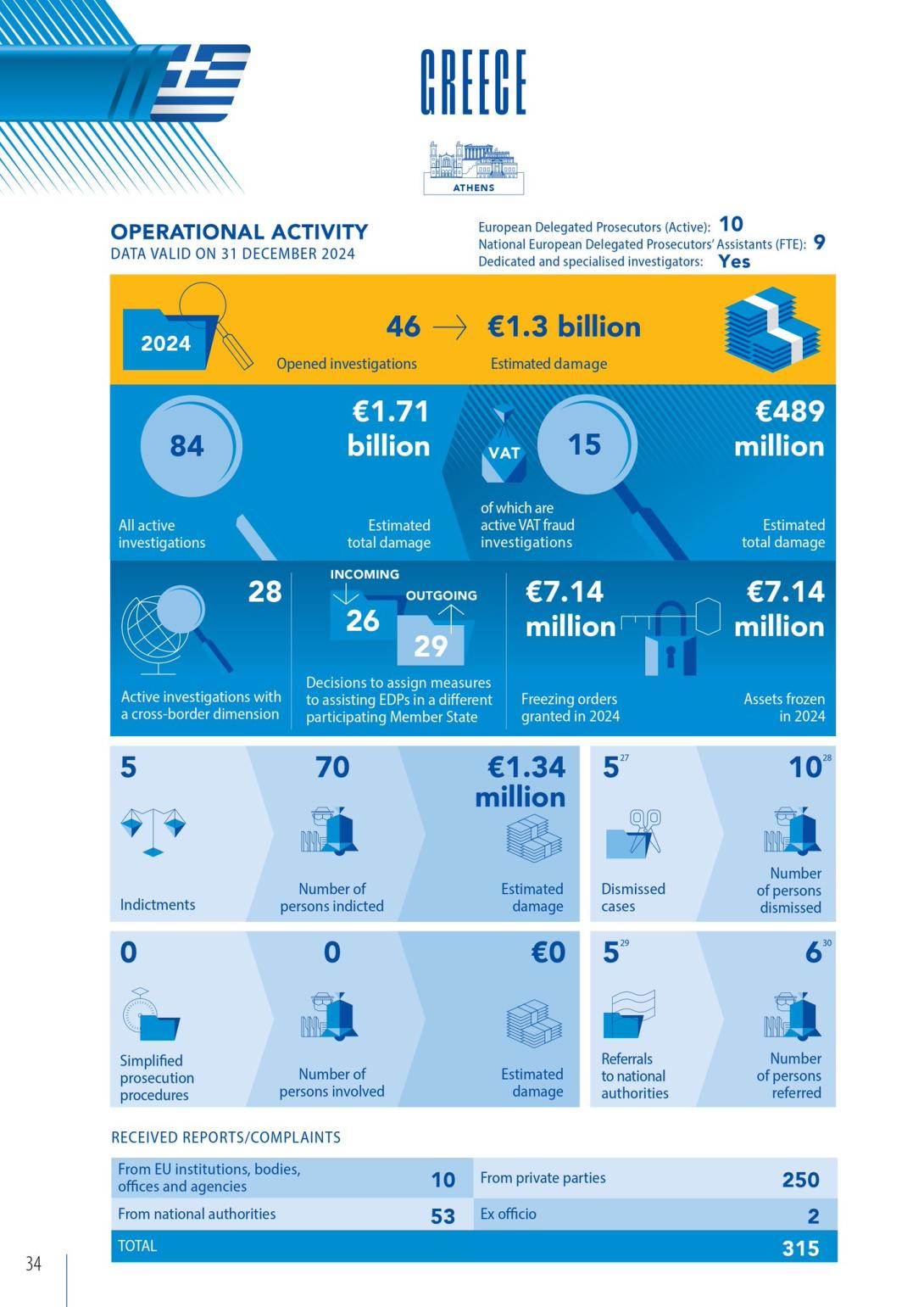 Στην ετήσια έκθεση της Ευρωπαϊκής Εισαγγελίας αναφέρεται ότι κατά το 2024 η υπηρεσία ξεκίνησε στην Ελλάδα 46 έρευνες με κατ’ εκτίμηση ζημιά ύψους 1.3 δισ. ευρώ. Συνολικά τρέχουν 84 έρευνες με εκτιμώμενη ζημιά 1.71 δισ.… pic.twitter.com/Y3NHbRHhbk— Nikodimos Kallinteris (@KNikodimos) March 4, 2025