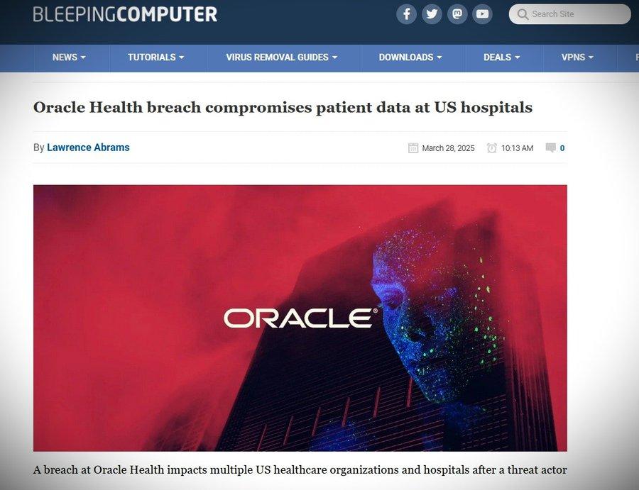 Όπως αναφέρει η εξειδικευμένη σε θέματα τεχνολογίας ιστοσελίδα Βleepingcomputer προσφάτως έλαβε χώρα παραβίαση της υπηρεσίας Oracle Health επηρεάζοντας πολλά νοσοκομεία των ΗΠΑ, αφού ένας χάκερ υπέκλεψε δεδομένα ασθενών.